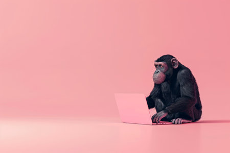 A monkey is sitting on a pink background and using a laptop. Concept of curiosity and intelligence, as the monkey appears to be engaged in a task that is typically associated with humans