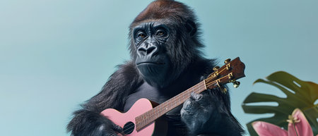 Gorilla with ukulele and guitar on blue background