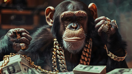 A creative and surreal image of a chimpanzee adorned with gold chains and rings, surrounded by stacks of cash, illustrating themes of wealth and opulence