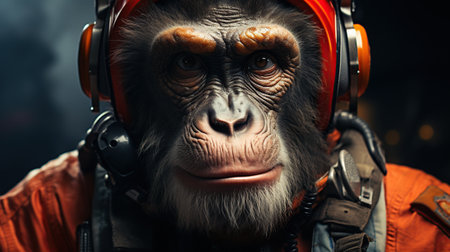 Chimpanzee in an orange suit and headphones on a dark background.