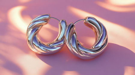 This image features two glossy metal hoop earrings with a reflective surface, set against a gradient pink and purple background, creating a modern and stylish visual.