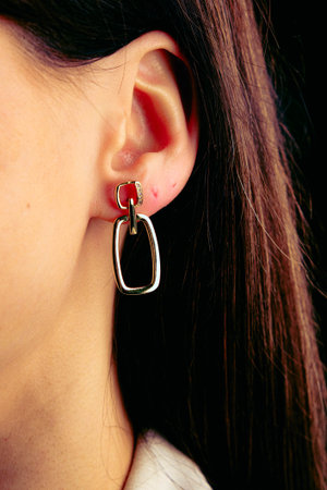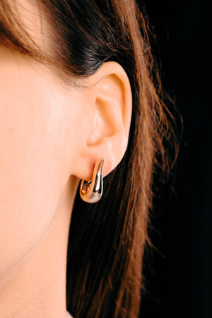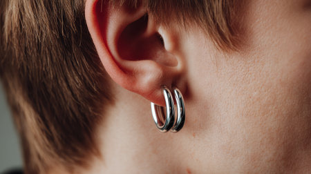 Stylish ear adorned with chic, minimalist hoop earrings, focusing on their fashionable design and understated elegance