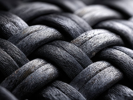 Tightly woven black and gray metal strands form a complex, textured pattern, highlighting industrial strength and intricate craftsmanship.