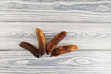 Brown bananas on textured wooden background. Fermented fruit is suitable for baking banana bread.