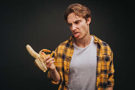 Young blond man in yellow shirt is reluctantly eating banana, isolated over black background