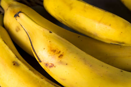 Clusters of ripe yellow bananas photographed on a fruit market. Overripe banana. Tropical fruits. Healthy lifestyle concept, source of vitamins.