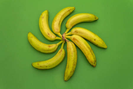 Several ripe yellow-green bananas laid out in the form of swirl on a green background, close-up, top view.