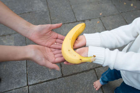 Woman's hand holding bananas, snack and fast food concept. Selective focus on hands with blurred background and copy space for text.