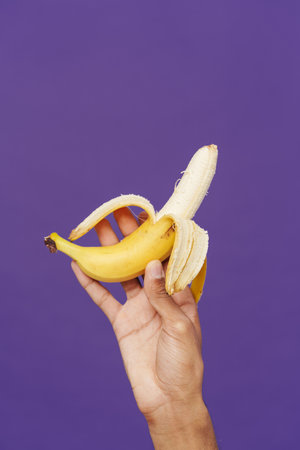 Closeup view of female hand holding a half peeled banana. Healthy snack time.