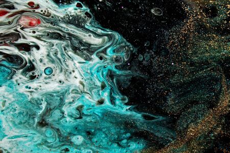 Fluid art background made of liquid. Galactic ocean with blue and green acrylic paint