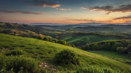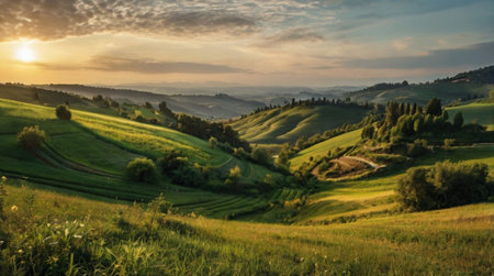Majestic sunrise over green hills.