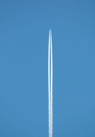 an airplane in a clear sky takes off leaving a line, vertical orientation