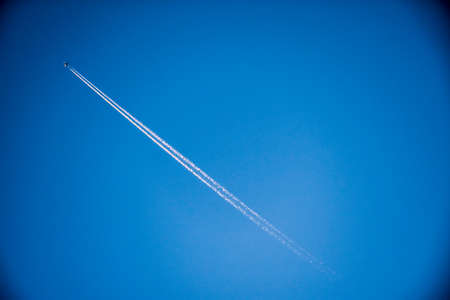 Wallpaper background of an airplane trace in the blue sky. Vignette effect.