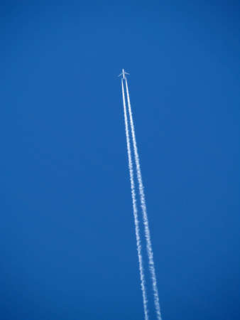 Airliner in the blue sky without clouds. There are engine tracks behind the plane.