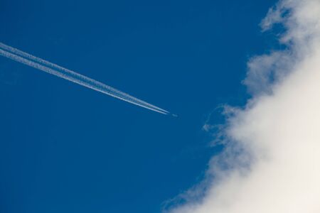 Aircraft condensation contrails in the blue sky inbetween some clouds