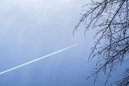 Jet of airplane in the blue sky with trace of condensation track against clear blue sky and tree branches