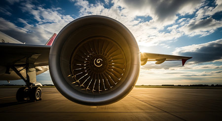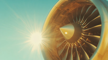 A stunning close-up of a jet engine capturing the sleek design and powerful turbines, illuminated by radiant sunlight, illustrating advanced technology in aviation.