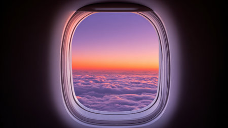 Gazing through an airplane window, soft orange and pink colors blend into a serene sunset. Clouds below evoke a sense of calm freedom and adventure.