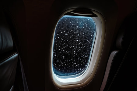 Looking out of the window of the plane, sitting in the cabin, night sky with Generative AI