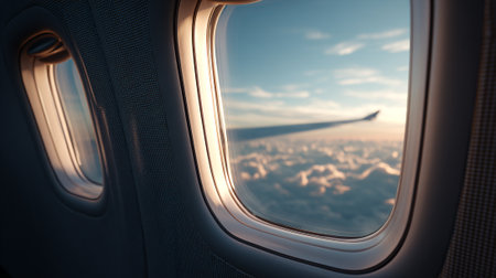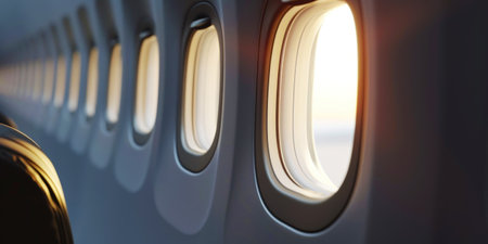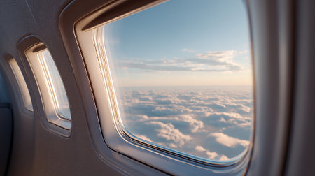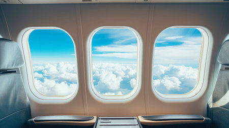 Serene airplane interior with a glimpse of sky from cozy seats perfect for travel and vacation vibes