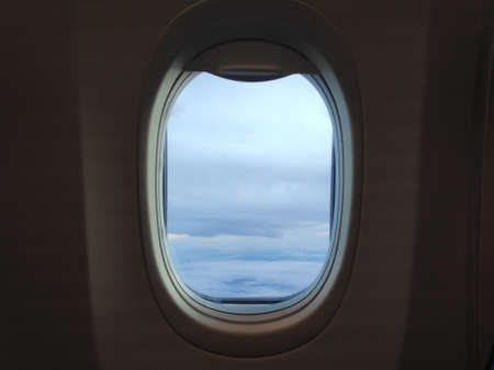 Airplane window with sky clouds view.