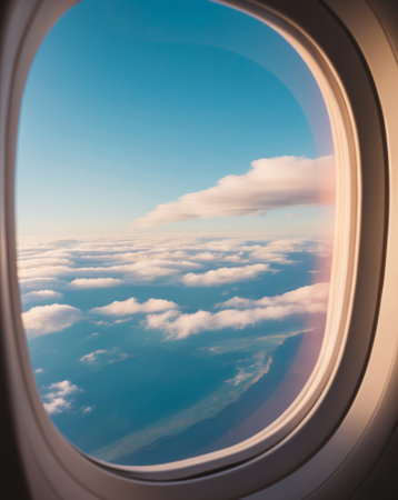 Airplane window view to cloudy sky and earth. Beautiful landscape from aircraft cabin. Flying without fear of flying, incidents and turbulence.
