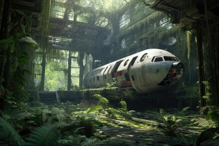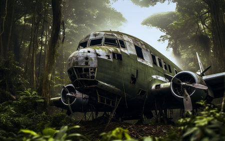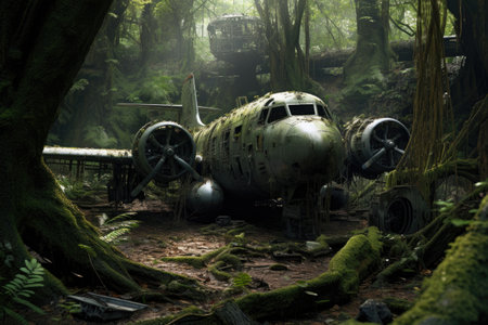 plane wreck surrounded by imposing jungle foliage, with vines and creepers growing on the wreckage, created with generative ai