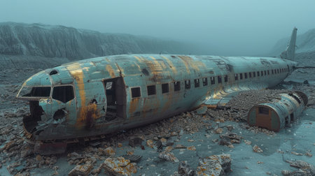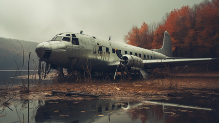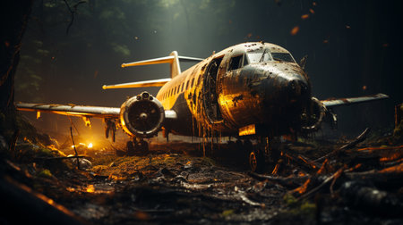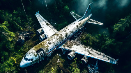 Dilapidated Ruined old airplane. Abandoned travel plane broken aviation. Generate Ai