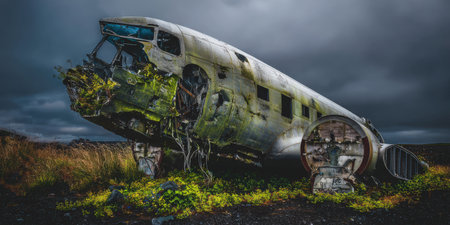 An abandoned airplane wreck rests on a desolate landscape beneath a dramatic overcast sky. The scene evokes feelings of mystery and solitude in a forgotten environment.