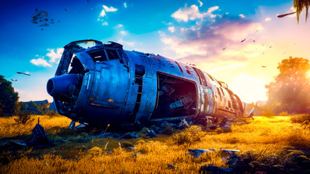 Abandoned military aircraft in the field at sunset. 3d rendering Realistic Post Apocalypse Landscape