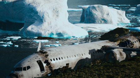 A weathered airplane wreck lies on rocky terrain, surrounded by towering icebergs and the calm ocean.