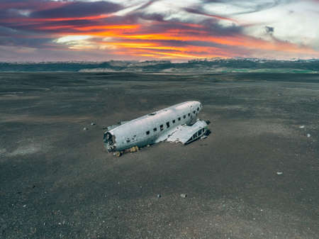 Aerial view of the old crashed plane abandoned on Solheimasandur beach near Vik,Iceland.