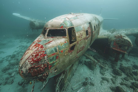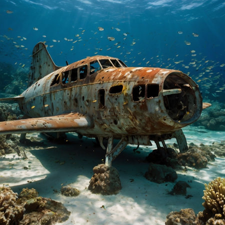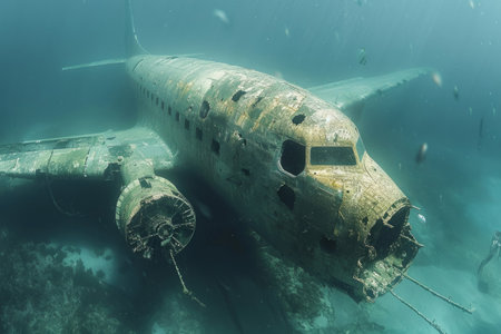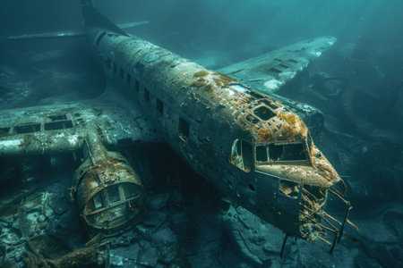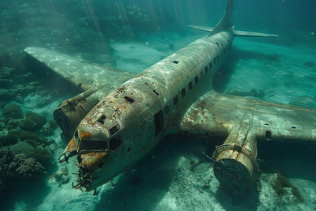 An ancient aircraft rests on the ocean floor, cloaked in marine mysteries.