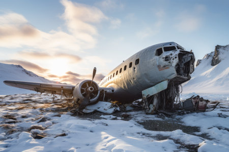 Airplane crash site in snowy mountains, illustrating concepts of aviation accidents, survival, and rescue