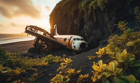 An abandoned airplane rests solemnly on a desolate black sand beach. Creating using generative AI tools