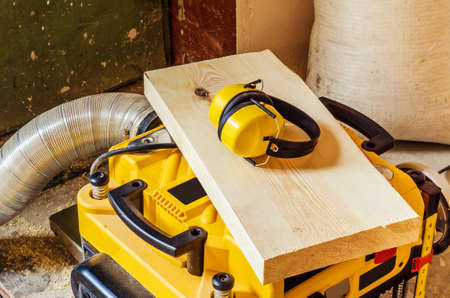 Sound-proof headphones lie on a board on a yellow woodworking machine