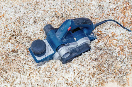 Manual electric planer lies in wood shavings. Woodwork. Manufacture of wood products. Joiner's tool.