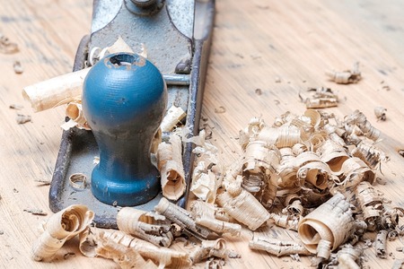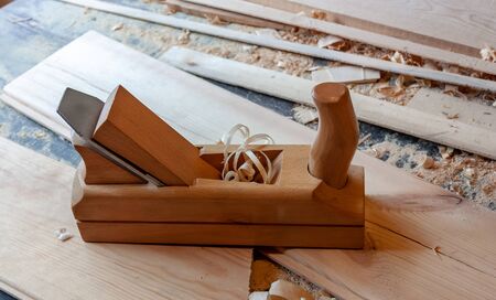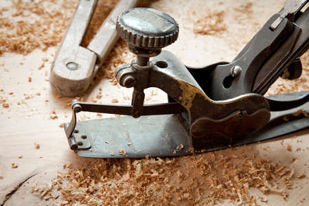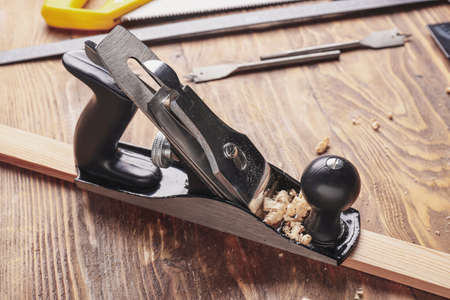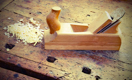 Planer with sawdust on the woodworking craft Workbench with vintage effect