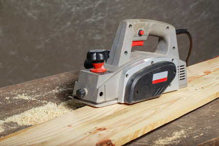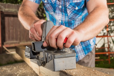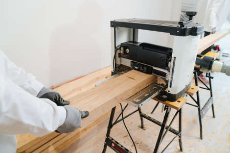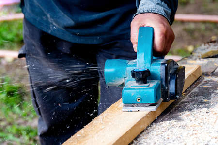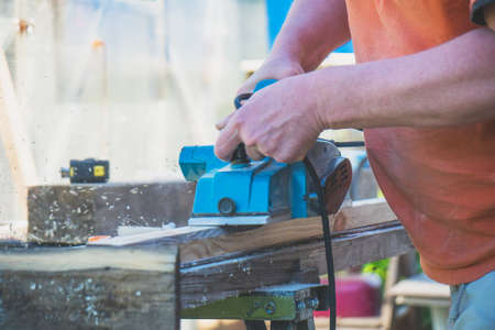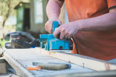 A man is whittling planks with an electric tool. A hand-held electric plane in the hands of a craftsman. Production of wood products. Construction, wood processing.