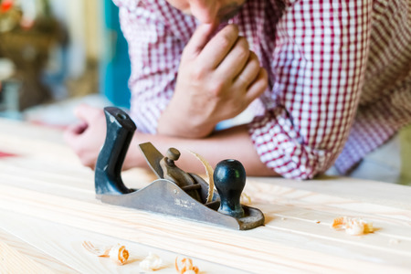 A man carpenter engaged in woodworking planes the surface of a wooden Board in his workshop with a hand plane. Concept of repair and construction.