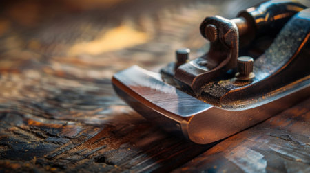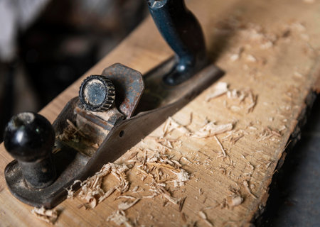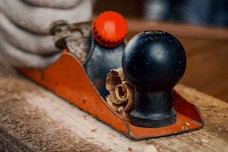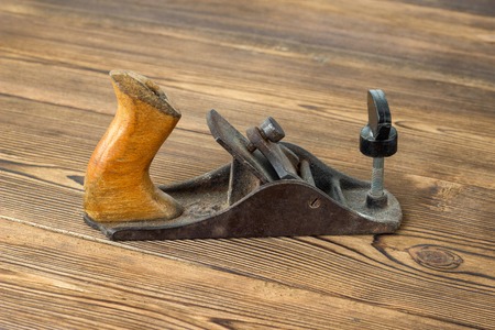 Old glider in the carpentry workshop on the table. Retro tool in use for over 20 years