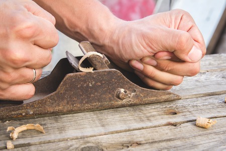Joinery. Planing a natural wood furniture panel with a manual planer. Hands with a planer.