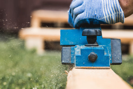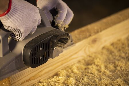 Carpenter hands in gloves electric plane planing lumber, flying shavings, sawdust. Close-up on gloved hands with an electric plane.