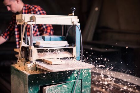 Cabinet planer machine is working with sawdust at wood workshop . Process of work surf gage machine