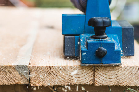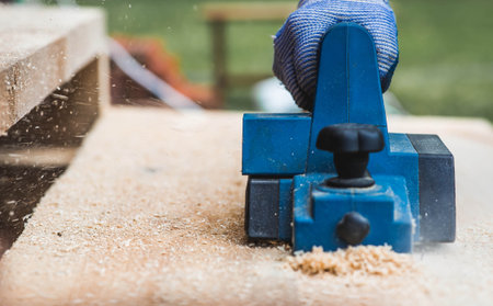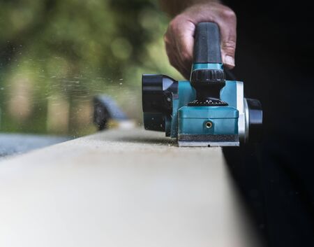 Male carpenter hand using an electric planer on wooden plank in workshop. Woodworker planing timber at construction site with sawdust spreading around. Work tool for carpentry. Lumber industry concept