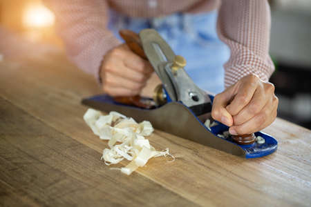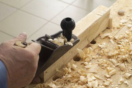 Joinery. Planing a natural wood furniture panel with a manual planer