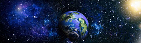 Abstract background space. Globe planet earth in galaxy universe with abstract sun on black background. Comet, asteroid, meteorite in fantasy galaxy