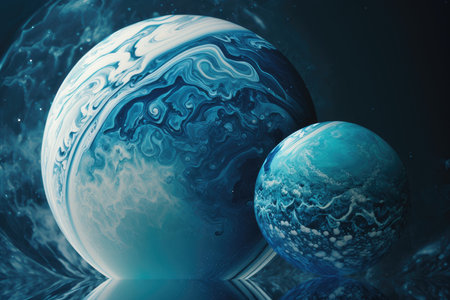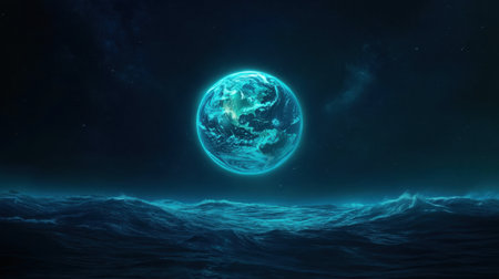 A captivating artwork showcasing a glowing blue planet suspended above dark ocean waves. This mesmerizing scene evokes a sense of wonder and tranquility in a cosmic setting.