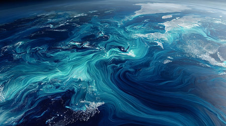 Ocean currents creating vibrant blue and turquoise plankton bloom patterns from an aerial perspective, showing the vast scale of marine life and water movement on earth