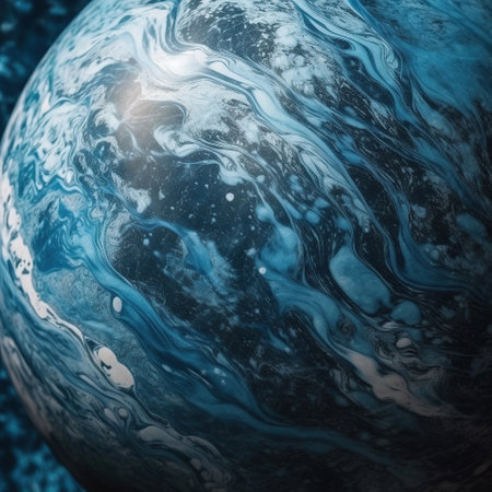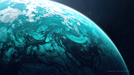 Swirling blue and green patterns cover the surface of a distant planet surrounded by stars, showing cosmic beauty.